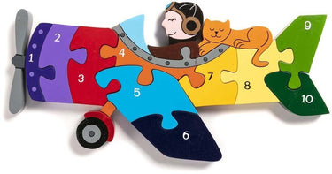 Choks Aways!! Alphabet Jigsaw's pilot and his ginger cat will steer children through the skies as they learn to count. Hand painted in bright colours, the chunky and durable wooden pieces of this toddler jigsaw puzzle are perfectly sized for little hands to put together and are numbered from 1 to 10. This handcrafted wooden jigsaw will encourage dexterity and logic and will make learning to count fun! Our Number Plane wooden puzzle comes beautifully packaged in a cardboard presentation box and a drawstring cotton bag is provided for storage after play. Age: 2+ Boxed product Cotton bag included Dimensions: 32cm x 17cm x 2cm