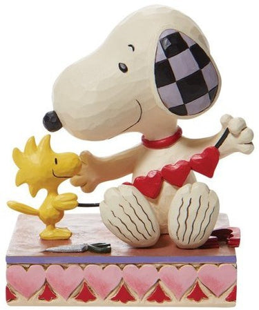In this "Stringing Hearts" figurine, Snoopy and his bestie Woodstock show off their heart-shaped garland they just newly made to celebrate some dog-loving fun. We think this would be the perfect gift for an anniversary, Valentine's, engagement, wedding or birthday. Its been delicately hand-painted with high attention to detail and crafted from high-quality cast stone. Jim Shore's unmistakable style evokes a sense of nostalgia with traditional themes, quilt patterns and design motifs.