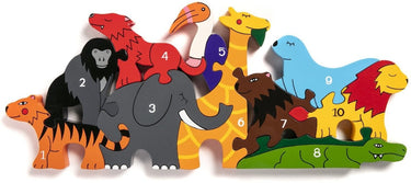 Wooden Number Zoo Jigsaw is a 10 piece puzzle which is education and a playset including a giraffe, lion, elephant and crocodile – see how many animals you can see!