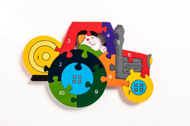 Wooden Tractor Number Jigsaw is a friendly farmer in his tractor helping any child how to count 1-10. Hand painted and brightly coloured with chunky pieces for easy construction