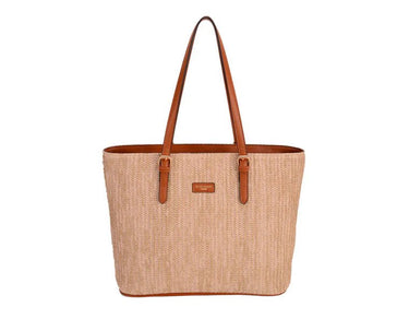 A stunningly neutral staple to your outfit, made with woven natural material and contrasting cognac tan faux leather.