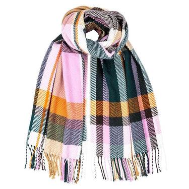 The Boardmans Celeste Chevron Scarf is the perfect fusion of style, warmth, and vibrant elegance. Boasts a captivating mix of pink, orange, and green tones arranged in a chic chevron pattern.