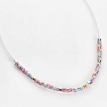 These mini myriad beads are rainbow coloured discs with white stripes, which evoke memories of the seaside. A series of thin discs are spaced with silver larger cylinder beads, the beads sit in the middle of the necklace creating a striking look. The beads are strung onto a thin piece of silver wire and fastens with a spring clasp complete with an extender chain. Combine this necklace with the matching earrings and bracelet.