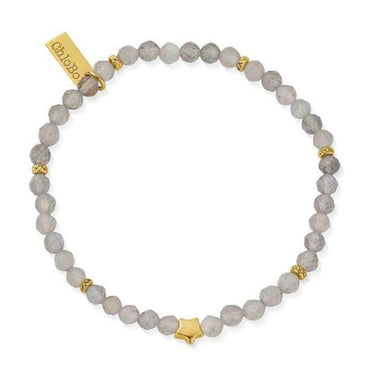This dainty ChloBo bracelet is made with an 18ct gold plated star charm and Labradorite beads. The Labradorite beads have a luminous quality that reflects the magic of the night sky.