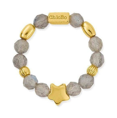 This Mystic Nights Ring by ChloBo is made with sterling silver or gold plated beads and a dainty heart charm with semi-precious Labradorite stones. Labradorite is believed to help us feel balanced, grounded, and enhance our intuition, whilst the star charm gives us hope and guidance to reach our ultimate destiny. Stack alongside your other rings or let it take centre stage on its own.