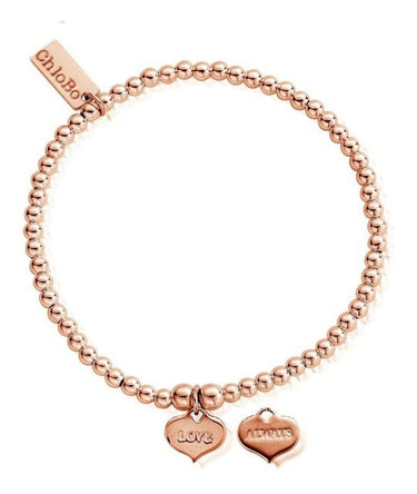 Handcrafted from rose gold plated on 925 sterling silver. This delicate bracelet features 3mm round beads and love always hear charm symbolising forever love. Looks great on its own or stacked together with other ChloBo Bracelets.