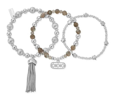 The Stars Align Stack of 3 is the perfect piece for those wanting an instant stack, combining a chunky tassel bracelet, alongside a Labradorite star charm piece for a pop of colour and a dainty starry layering bracelet for the ultimate stack. All crafted from sterling silver.