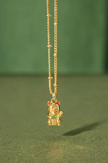 Bring good fortune and playful charm to your look with this gold-plated necklace featuring a detailed lucky cat pendant on a delicate satellite chain.