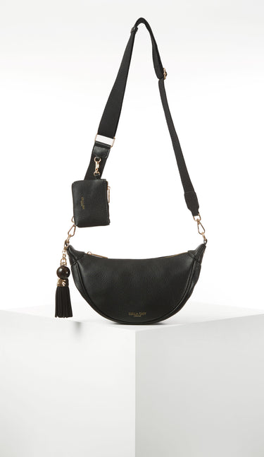 A sporty, half-moon sling bag with a canvas strap and detachable purse for small essentials. Roomy and practical with a zip-top closure.