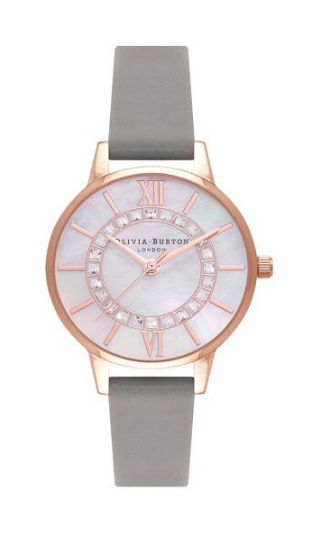 Part of Olivia Burton Wonderland Collection. This watch has a mother of pearl dial, rose gold markers and a grey leather strap.