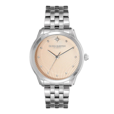 The Olivia Burton Celestial 36mm Starlight Blush & Silver Bracelet Watch is inspired by elegant star-filled skies and features a dusk blush dial and luxe bracelet strap.