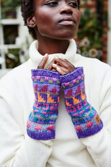 Women's knitted wool fingerless gloves. This wooly wristwarmer is fleece lined for extra comfort. Vibrant purple fair isle patterns. Fair trade and handmade in Nepal.