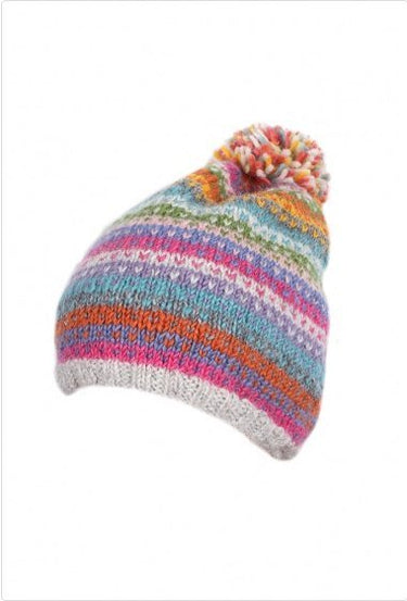Pachamama Villarica Bobble Beanie. Hand made using ethically sourced materials. This Pachamama woolen Bobble Beanie in the Villarica design with fleece lining is perfect for keeping your head warm and ears snug when out and about in the cooler months. Matching items available.