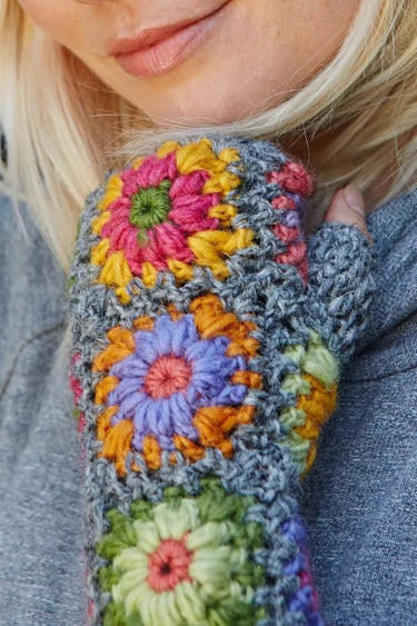 Pachamama Woodstock Handwarmers. Hand made using ethically sourced materials. These Pachamama woollen Handwarmers in the Woodstock design with fleece lining are perfect for keeping your hands warm and snug when out and about in the cooler months. The opened ended design means your fingers are free allowing you to continue with daily tasks with easy. Matching items available.