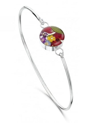 Handmade silver bangle with real flowers set in resin.