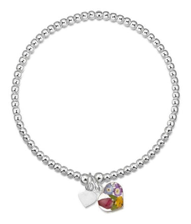 This bracelet comprises a single strand of sterling silver beads & a heart-shaped charm with tiny flowers including a forget-me-not, miniature rosebud & tiny purple verbena. Each bracelet is handmade and unique with each flower slightly varying in colours and sizes.