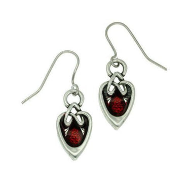 St Justin Miracle Ornate Heart Earrings are made from heart-shaped pewter earrings with a red enamel centre. Hanging on surgical steel ear wires.