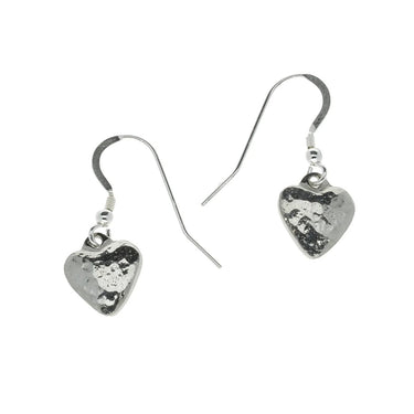 Small planished heart drop earrings from St Justin. Cornish tin hearts on sterling silver hooks.