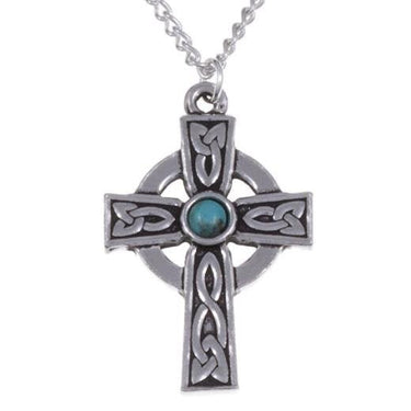 The St Justin St Petroc gemstone cross necklet has an embossed Celtic design and central cabochon on a tin-plated curb chain and features a turquoise gemstone.