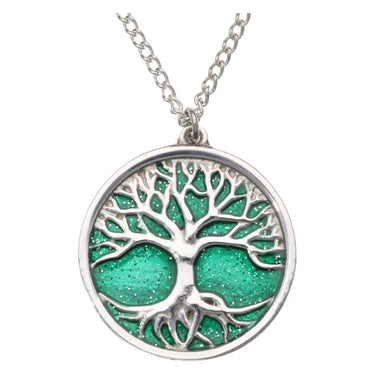 Tree of life pendant with green glitter enamel on a 18'' plated curb chain. An intricate and detailed pewter tree of life on top of a green glitter enameled disc.