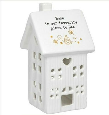 Ceramic ivory coloured tealight candle holder in the shape of a house from the Thoughtful Words range. It has a message 'Home Is Our Favourite Place to Bee' on the roof in black lettering finished with gold foil decal showing bees and a beehive illustration.