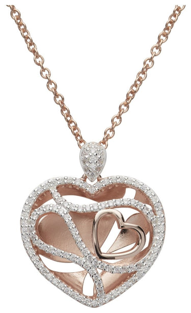 This beautiful Heart Necklace features an open design with streams of zirconias running across the front in a fun swirling pattern. The miniature rose gold heart within the design finished this piece off to make a truly stunning necklace.