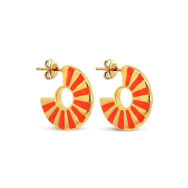 Bold, semi hoop earrings give off a sunshine energy with their unique spiral silhouette and vibrant orange enamel inlays. Great to add a pop of colour to your outfit.