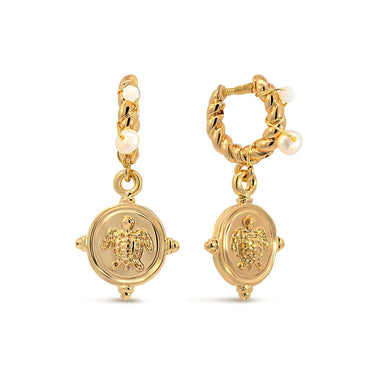 Ocean-inspired gold toned hoop earrings featuring intricate turtle medallion charms with twisted hoops and dainty pearls.