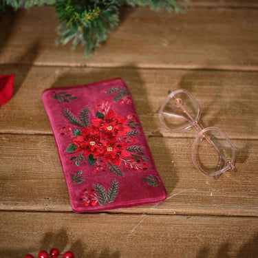 Poinsettia Velvet Embroidered Glasses Case With Glass Beads