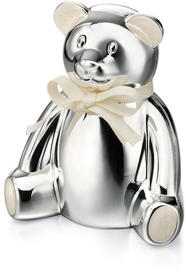 An adorable silver-plated money box shaped like a teddy bear with a little cream bow.