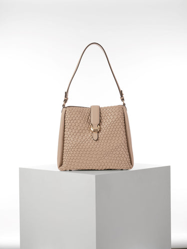 A spacious, tactile hobo tote with an intricate woven design and wide side panels. Features internal zip compartments, a phone pocket and key clip. Finished with a statement clasp.