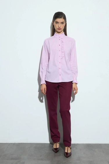 A striped long sleeve shirt in pink. With pearlescent buttons and ruffle detail, this top is really pretty.