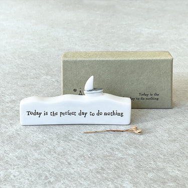 A sweet and calming porcelain decoration featuring a peaceful scene and the words: “Today is the perfect day to do nothing.” A gentle reminder to slow down and enjoy the moment—perfect for display on a shelf or desk.