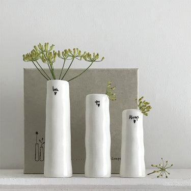 A beautiful set of three small porcelain bud vases, each decorated with delicate designs and the heartfelt phrase “Love You Always.” Perfect for displaying single flowers or small blooms, these charming vases add a touch of love and elegance to any space.