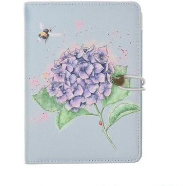 This personal planner is decorated with a purple hydrangea with a bee hovering gently about it. Secure closed with elastic around a wren shaped stud. Inside you can add or replace pages using the six-ring binder. There is also a place to keep cards and a pocket for notes and receipts.