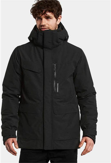 Sebastian is a padded, fully windproof and waterproof jacket with taped seams. It has a regular, straight cut fit. The Sebastian jacket is made from a soft polyester fabric with a smooth matte finish. The jacket has a taped black reflective detail around the padded and adjustable detachable hood. Featuring Didriksons name and logo in reflective print on he chest and one on the shoulder on the back. with a reflective zip pull. There are four pockets on the front, two can be accessed from two sides. One pocket has a water resistant zip while the others have snap fasteners. The inside pockets with zip and two mesh inside pockets, full length two way front zip with a protective storm flap. The jacket can be adjusted using a drawstring at the hem and the cuffs can also be adjusted.