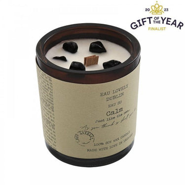 The Eau So Calm Candle by Eau Lovely. The grounding and protecting benefits of the Hematite stone sit immersed in the fresh fragrance of Chamomile, Lime verbena and Moroccan Lemon.