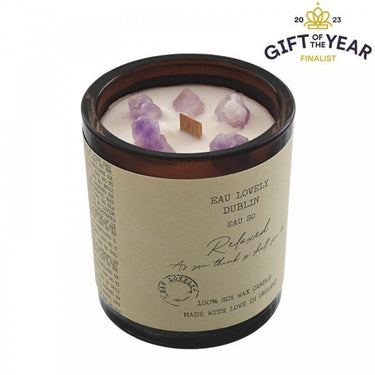 The Eau So Relaxed Candle by Eau Lovely. A calming atmosphere of Lavender, Chamomile and Lemon Zest, with the naturally relaxing qualities of the Amethyst crystal.