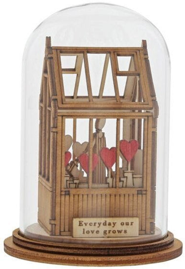 Presented in a beautiful glass dome on a wooden base, this decoration encases a greenhouse adorned with beautiful blossoming flowers. It has been produced using sustainably sourced wood and a glass dome instead of plastic. A stunning decorative gift or even a self purchase for home decoration.