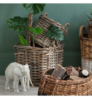 Set of Two Rattan Material Baskets, ideal for home decora and practical use including log baskets plants or even a toy basket.