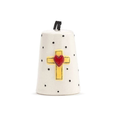 Remind loved ones around you of the blessings that surround us every day, with this stunning, whimsical bell. Made with ceramic, and fashioning a gold cross with a red heart on a backdrop of black polka dots, this stunning bell hangs by a black satin ribbon and comes ready to gift.