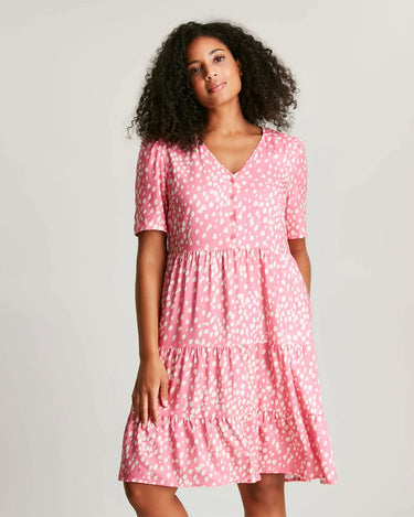 Joules Half Button V neck Dress in pink spot, great dress for the summer, full of joy and summer sunshine, Ideal to wear with cream or white trainers.