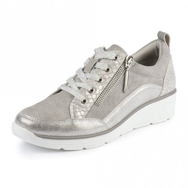 This trainer has a sleek and smooth wedge heel. Giving you an extra 4cm in height, but still being comfortable. Crafted from metallic silver and the snake print finish. Finished with zip detail down the size, making it easier and quicker to put these trainers on and off.