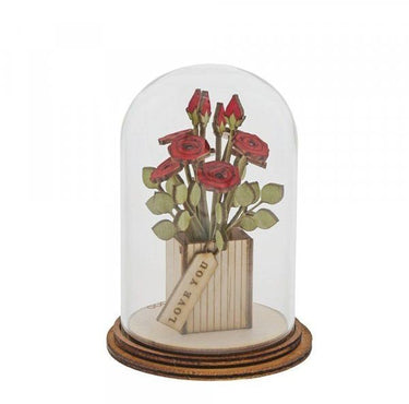 This classic vintage style cloche will make a stunning display in your home. Produced using sustainable sourced wood for the base and a glass dome instead of plastic, this eco friendly decoration encases a bunch of beautiful red roses with a love you tag.