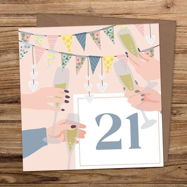 21 Bunting and Glasses Card decorated with a pretty bunting and friends celebrating with fizz. All cards are printed on 350gsm luxury uncoated card, with a Kraft Card envelope and encased in a compostable polybag. Card approx. 15cm x 15 cm