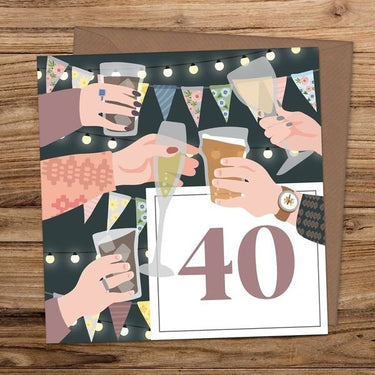40 Birthday Card with Bunting, Fairy Lights and friends celebrating with fizz and beer. All cards are printed on 350gsm luxury uncoated card, with a Kraft Card envelope and encased in a compostable polybag. Card approx. 15cm x 15 cm