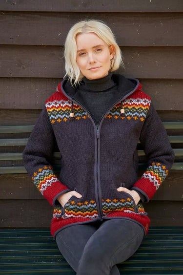 Pachamama Women's wool hand knitted hoodie with zip. Classic and colourful fair isle patterns. Fair trade and handmade in Nepal.