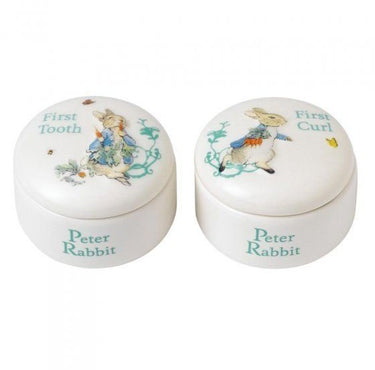 This charming pair of Peter Rabbit First Tooth and Curl Box would make a perfect and unique gift, weather its the birth of a new baby or Christening gift this is sure to raise a smile. The artwork for each box is taken from the original illustrations from the Beatrix Potter stories. The material is ceramic and they are presented in a beautiful Beatrix Potter branded gift box. Please note that these are not toys and are not suitable for Children or babies.