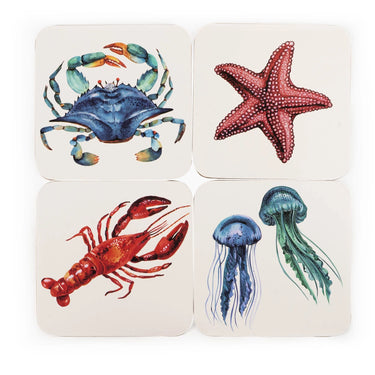 This set of 4 coasters features illustrations of sea creatures, including a vibrant crab, a textured starfish, a striking lobster, and a gracefully flowing jellyfish. These coasters are perfect for sea lovers and enthusiasts of marine life. The vivid colours and intricate details capture the essence of the ocean's diverse inhabitants, bringing an element of the deep sea to your coffee table or dining setup.