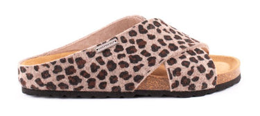 The Shepherd Carolina is a pure wool sandal/slipper for women. The felted wool outer cross-over straps have a leopard print design and a cork insole. Each Shepherds slippers is handcrafted with sustainable and natural raw materials wool and cork to create a comfortable and stylish wool sandal. The wool and cork have the added benefits of being antibacterial and breathable.